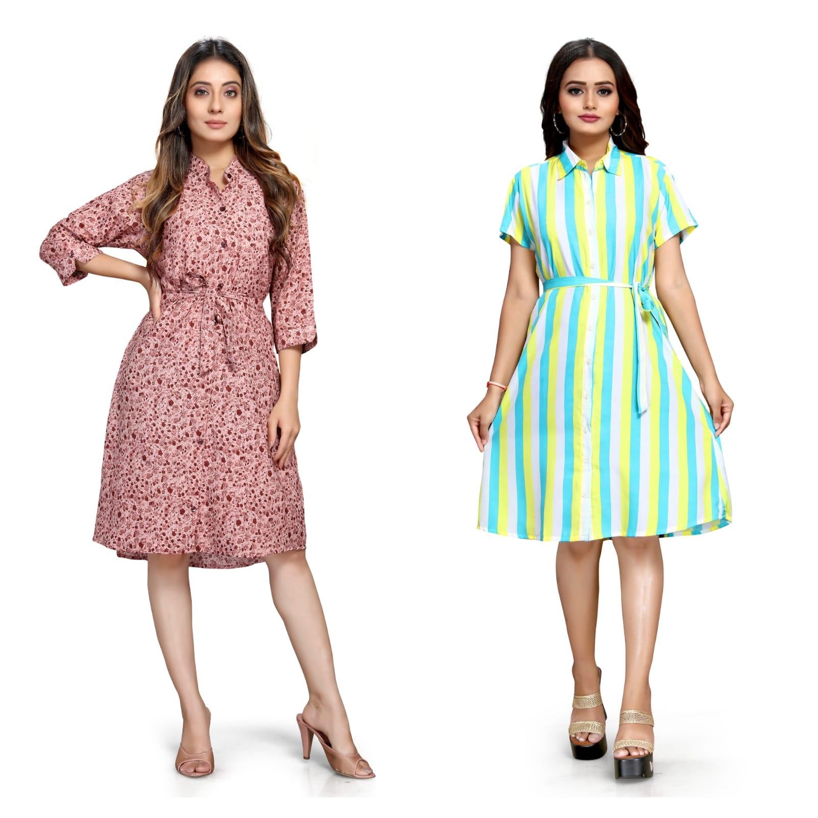 Product Name: Women's Crepe Printed Shirt Style Short Dress Buy 1 Get 1 Free Package Contains: It has 2 Piece of Short Dress Fabric: Crepe Color: Multicolor Pattern: Printed Style: Shirt Occasion: Casual Combo Of: Pack of 2 Length: Knee Length Sleeve Length: Full/Short Sleeve Neck Type: Shirt Collar Weight: 395
